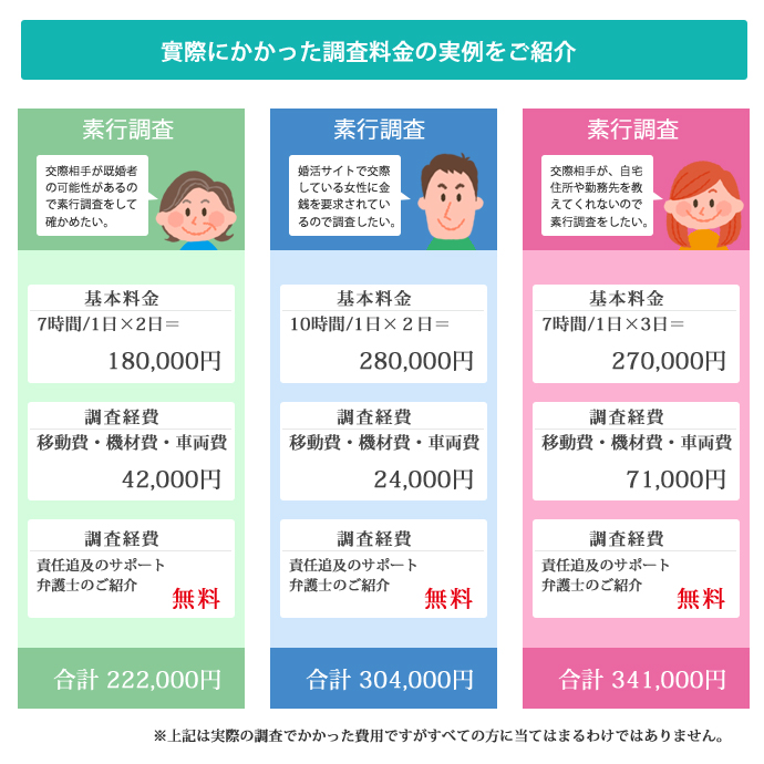 婚活サイトに潜む結婚詐欺被害の調査を行う為に、実際に依頼された方の一般的な料金事例をご紹介いたします。